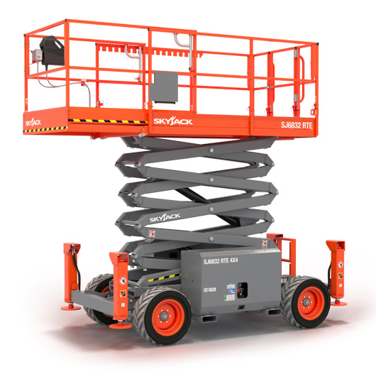 The Skyjack SJ6832 Rough Terrain diesel scissor lift features an impressive platform capacity of 454 kg and industry-leading gradeability of up to 50%. With its crossover symmetrical 4×4 drive, the SJ6832 delivers maximum torque to all wheels, providing superior performance across all types of terrain.